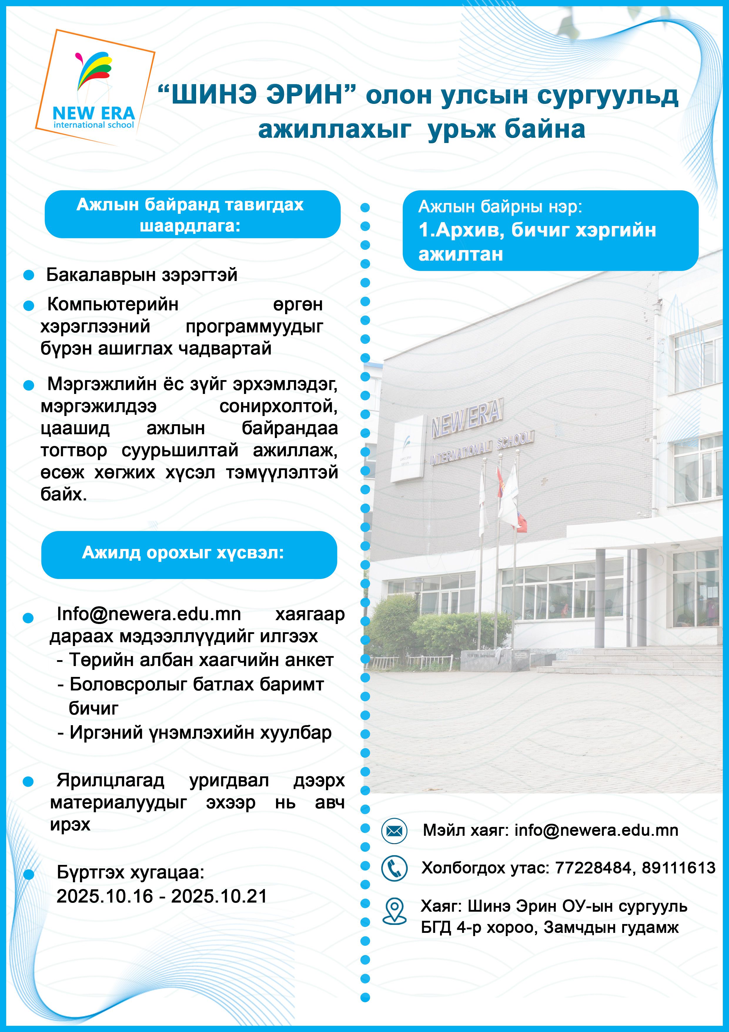 "ШИНЭ ЭРИН” олон улсын сургуульд ажиллахыг урьж байна.